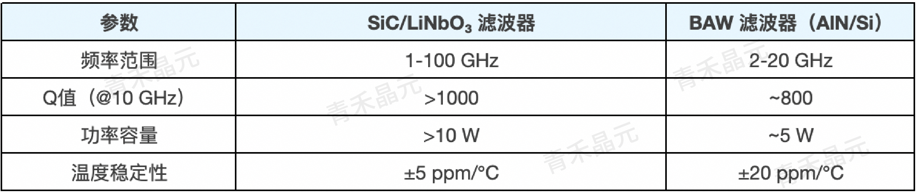 在5G通信向毫米波频段演进及各领域雷达性能升级的背景下,高频滤波器正面临前所未有的技术挑战。传统声表面波(SAW)器件凭借制造工艺简单,性能稳定,体积小巧,成本低廉等优势,长期以来一直是射频滤波领域的主流方案,然而受限于衬底材料的物理性能,使SAW仅应用在3GHz以下低频段工作,而体声波(BAW)技术虽能支持更高频率,却始终被高成本、高温稳定性差等问题所困扰。针对这一产业痛点,青禾晶元通过自主创新的室温键合技术,成功开发出碳化硅(SiC)基铌酸锂(LiNbO₃)薄膜衬底,为SAW器件在高频滤波领域带来突破性进展。