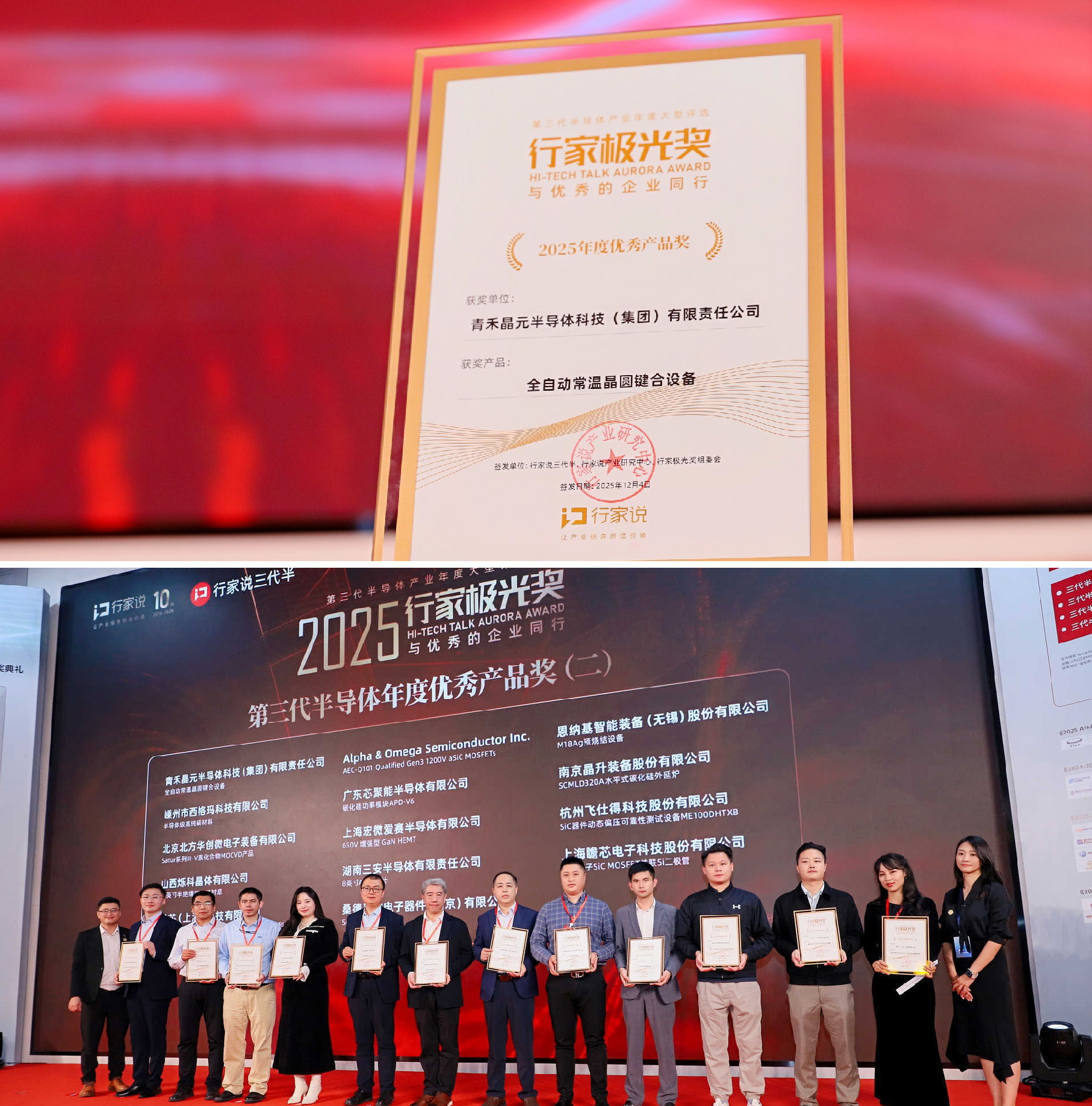 12月4日,在行家说三代半年度盛典上,青禾晶元SAB6110全自动超高真空常温键合设备,凭借其颠覆性的工艺创新与卓越性能,成功斩获 “2025第三代半导体设备年度优秀产品奖”。